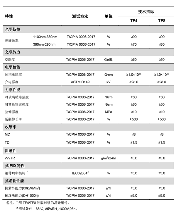 F·RST TF4和TF8膠膜是杭州福斯特應用材料股份有限公司開發的一款交聯型聚烯烴封裝膠膜,具有高的水汽阻隔性、電氣絕緣性及優異的抗PID性能,對于PID敏感的電池如P型PERC雙面電池、N型PERT雙面電池、IBC電池等非常適用。同時TF系列膠膜特別適用于無封邊雙玻組件、高濕氣環境中的單玻組件等。